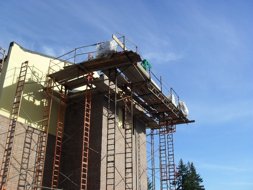 After doing all the forth floor window openings it was time for us to climb up the rigging the Mason's had going and seal off the ends of the buildings.